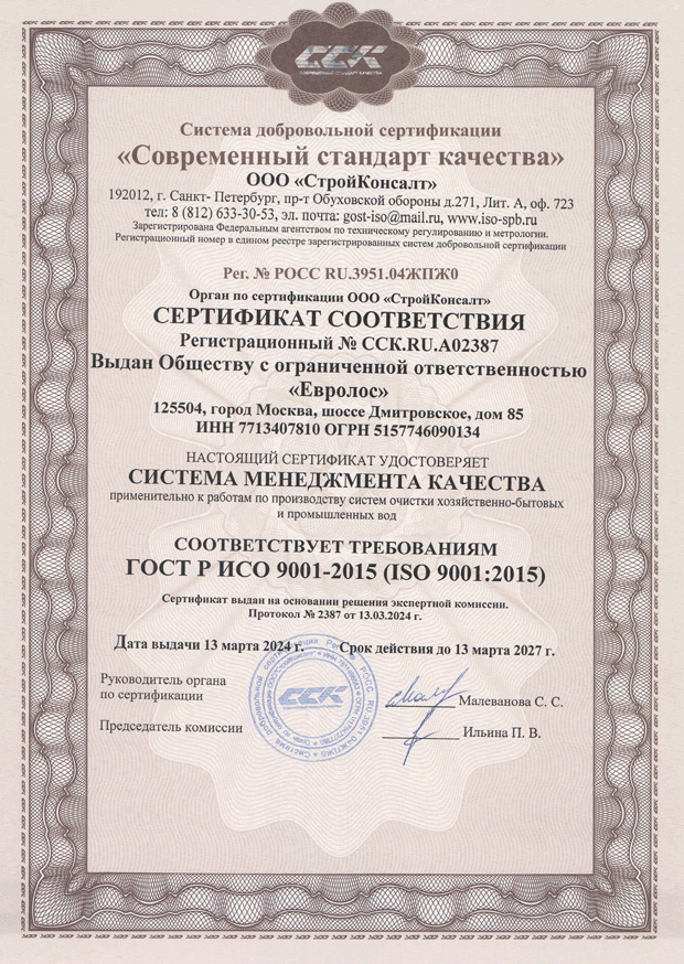 Компания ООО «Ледерон» является официальным представителем производителя очистных сооружений Евролос, что подтверждается выданным нам сертификатом дилерства.